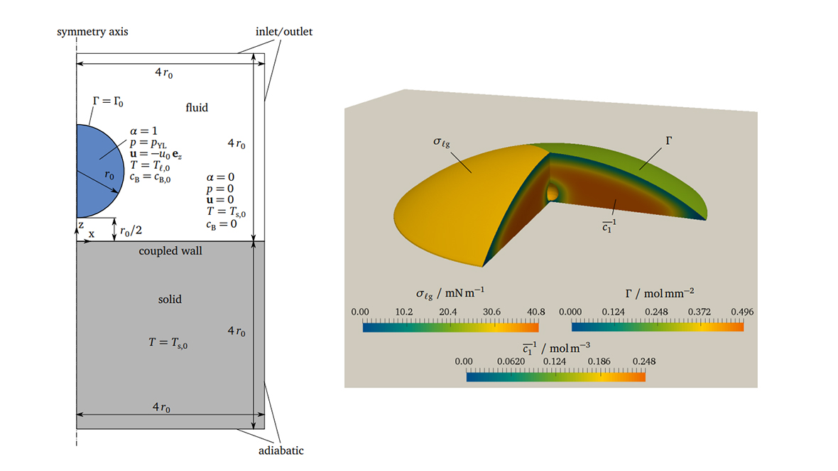 Um die Wechselwirkungen im Druckprozess zwischen Wärme- und Stofftransport auf der einen und der Hydrodynamik auf der anderen Seite besser zu verstehen, werden im Rahmen dieses Teilprojekts numerische Simulationen mit der algebraischen Volume-of-Fluid-Methode durchgeführt. Durch Einbeziehung geeigneter Materialmodelle wird der Einfluss der Temperaturverteilung und der Tensidkonzentration auf die Hydrodynamik im numerischen Modell berücksichtigt. Im Rahmen des Teilprojekts soll auch die Ad-/Desorption von Tensiden an der Flüssigkeit-Dampf-Grenzfläche und der Feststoff-Dampf-Grenzfläche untersucht werden. Die Ad-/Desorptionsprozesse an den Grenzflächen führen zu konvektiven Strömungen wie der Marangoni-Strömung und beeinflussen auch die Tensidkonzentration. Die Ad-/Desorption an der Flüssigkeits-Dampf-Grenzfläche wird mit Hilfe der Langmuir-Freundlich-Kinetik modelliert, und die entsprechenden kinetischen Parameter werden in Zusammenarbeit mit dem Teilprojekt C01 mit Hilfe der Blasendrucktensiometrie bestimmt.