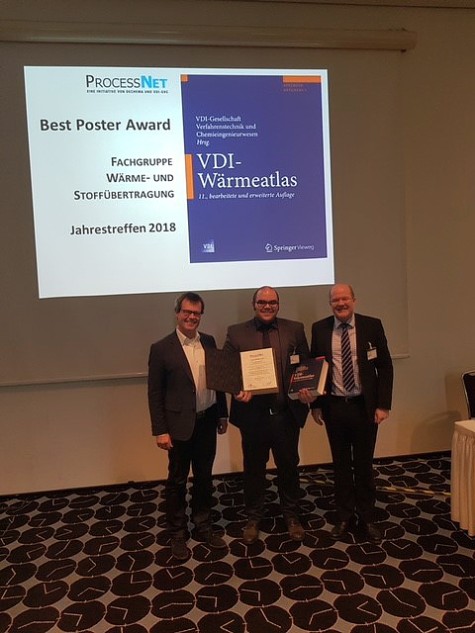Im Rahmen des Jahrestreffens der ProcessNet Fachgruppen vom 6. bis 9. März 2018 in Bremen ist Michael Heinz (Projekt A04) mit dem Best Poster Award der Fachgruppe Wärme- und Stoffübertragung ausgezeichnet worden.